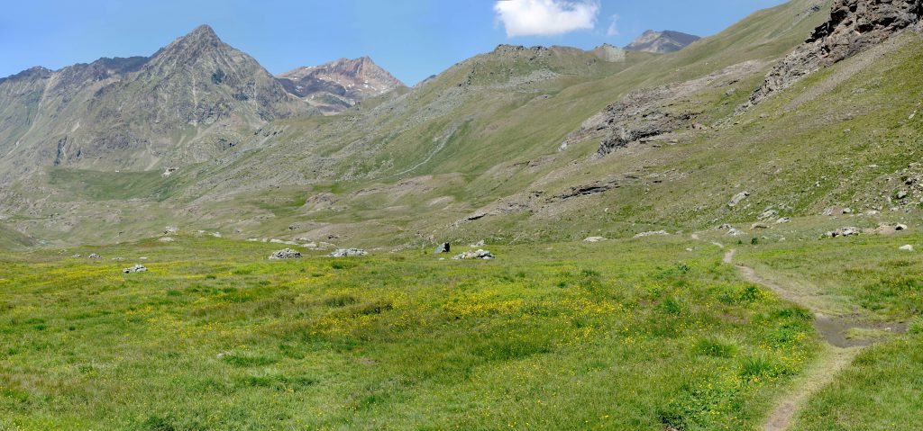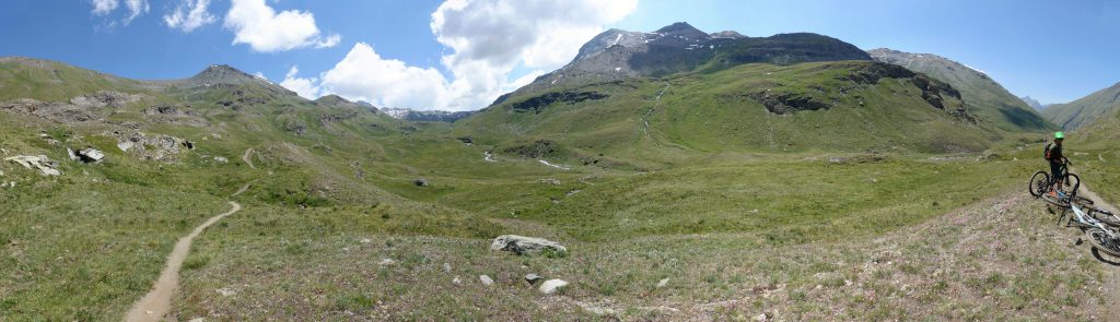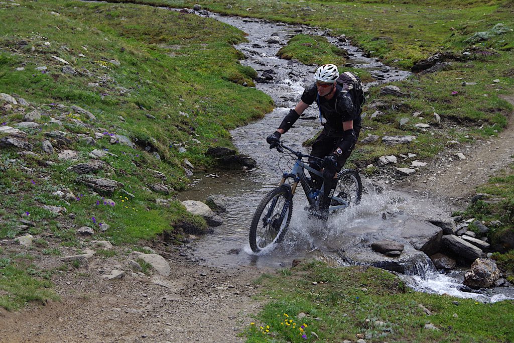 Von dort geht es dann mit dem MTB weiter auf einer Schotterstraße, unterwegs vorbei an einigen Wasserfällen, in Richtung Ponton. Nach 3,1 km kommt man an der Alp Tzavanis vorbei. Nach weiteren 1,4 km zweigt der Weg an einem Bach nach links ab über eine Holzbrücke. Diesem Weg weiter für etwa 2,5 km bis auf ca. 2600 hm folgen und dann wieder links abbiegen auf einen kleinen Trail. Dieser Trail führt jetzt bis zur Passhöhe. Bei sehr guter Kondition kann man den größten Teil des Anstieges auf dem Bike pedalieren. Nur die letzten ca. 150 hm bis zum Passo dell’Invergneux auf 2906m müssen dann geschoben werden. Wer nicht so fit ist, muss eben länger schieben, so wie ich… 😉
