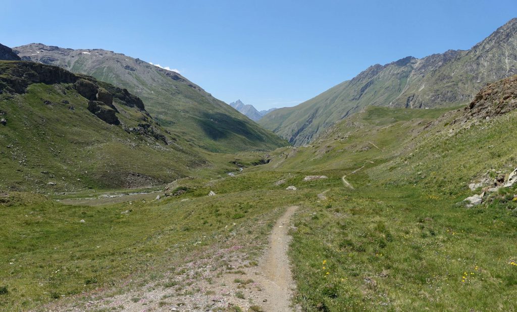 Als Belohnung für die Mühen gibt es von der Passhöhe aus den tollen, ca. 10km langen, Banzai-Trail. Anfänglich sehr flowig über Steinfelder und Wiesen auf relativ flachem Gelände in Richtung Grauson Tal, vorbei am Hüttendorf Grauson Inferiore auf ca. 2270 hm.